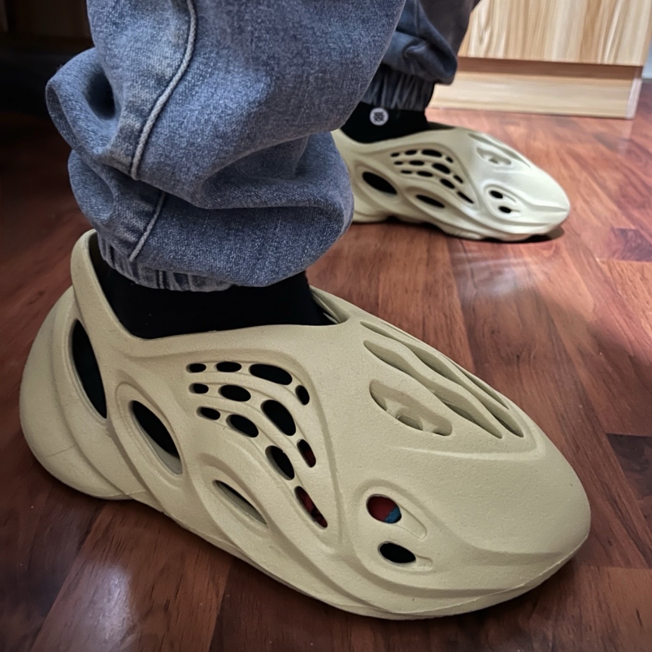 Adidas Yeezy Foam RNNR в цвете Sulfur (песочно-жёлтый). Эта модель была разработана в сотрудничестве с Канье Уэстом и выпущена в апреле 2022 года.