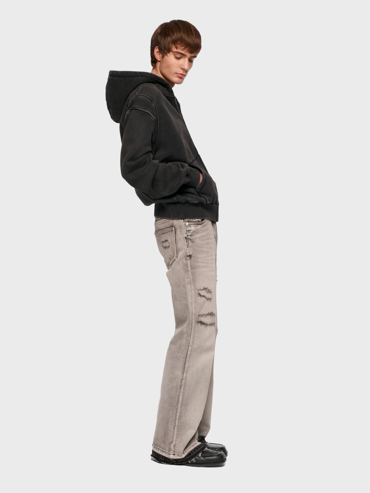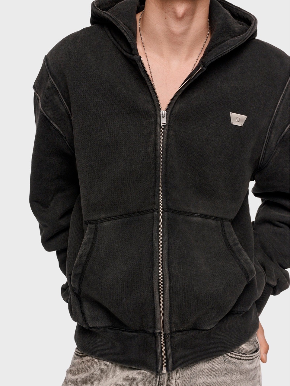 Худи на молнии из хлопкового джерси с эффектом выцветания. Модель с акцентными плечами и фирменным трапециевидным логотипом на груди.