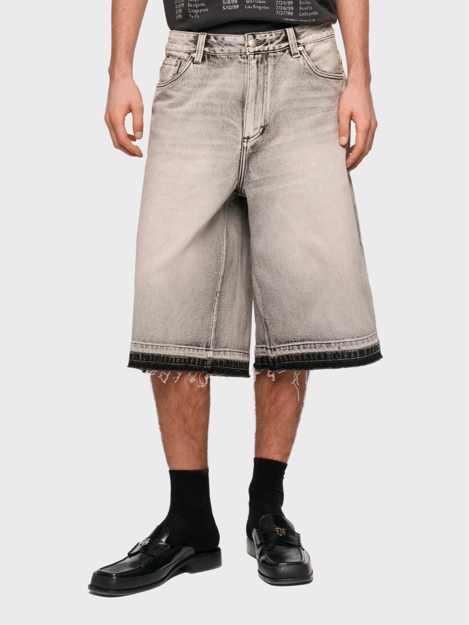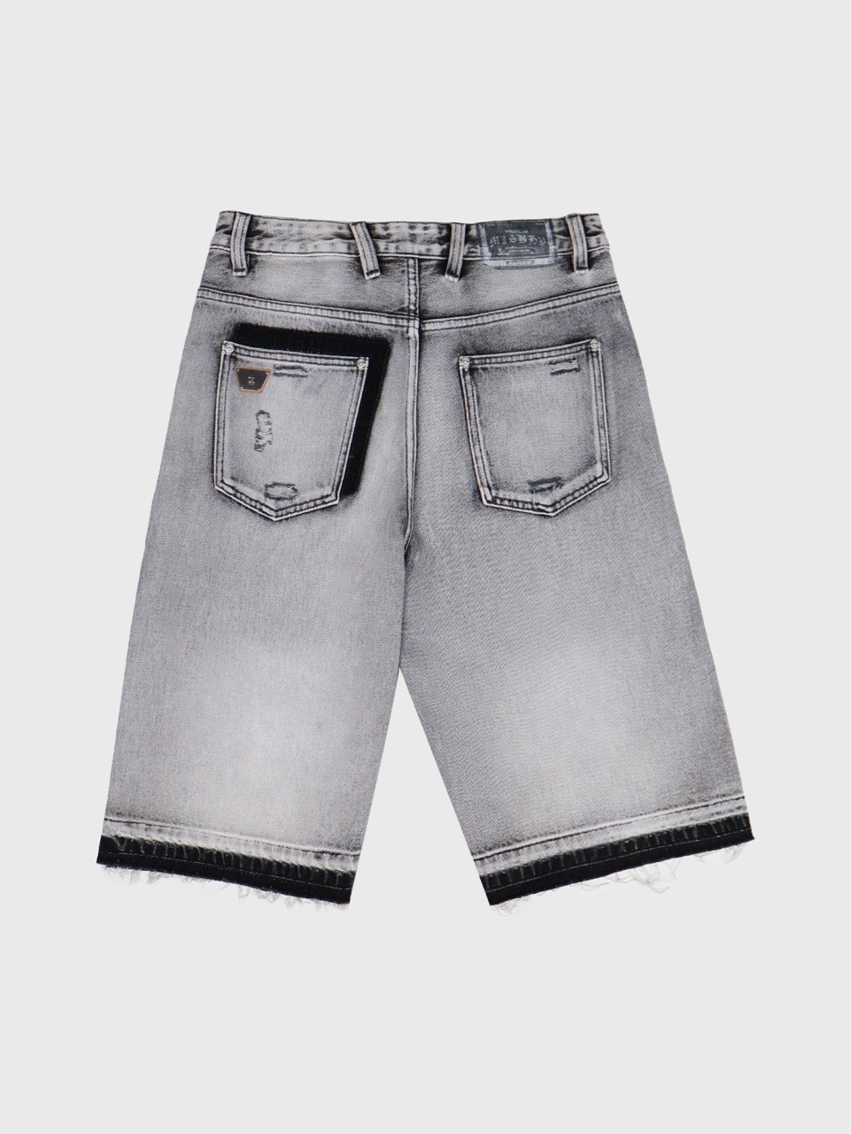 Джинсовые шорты свободного кроя с сезонным вымытым оттенком. Контрастное чёрное покрытие на манжетах и заднем кармане.